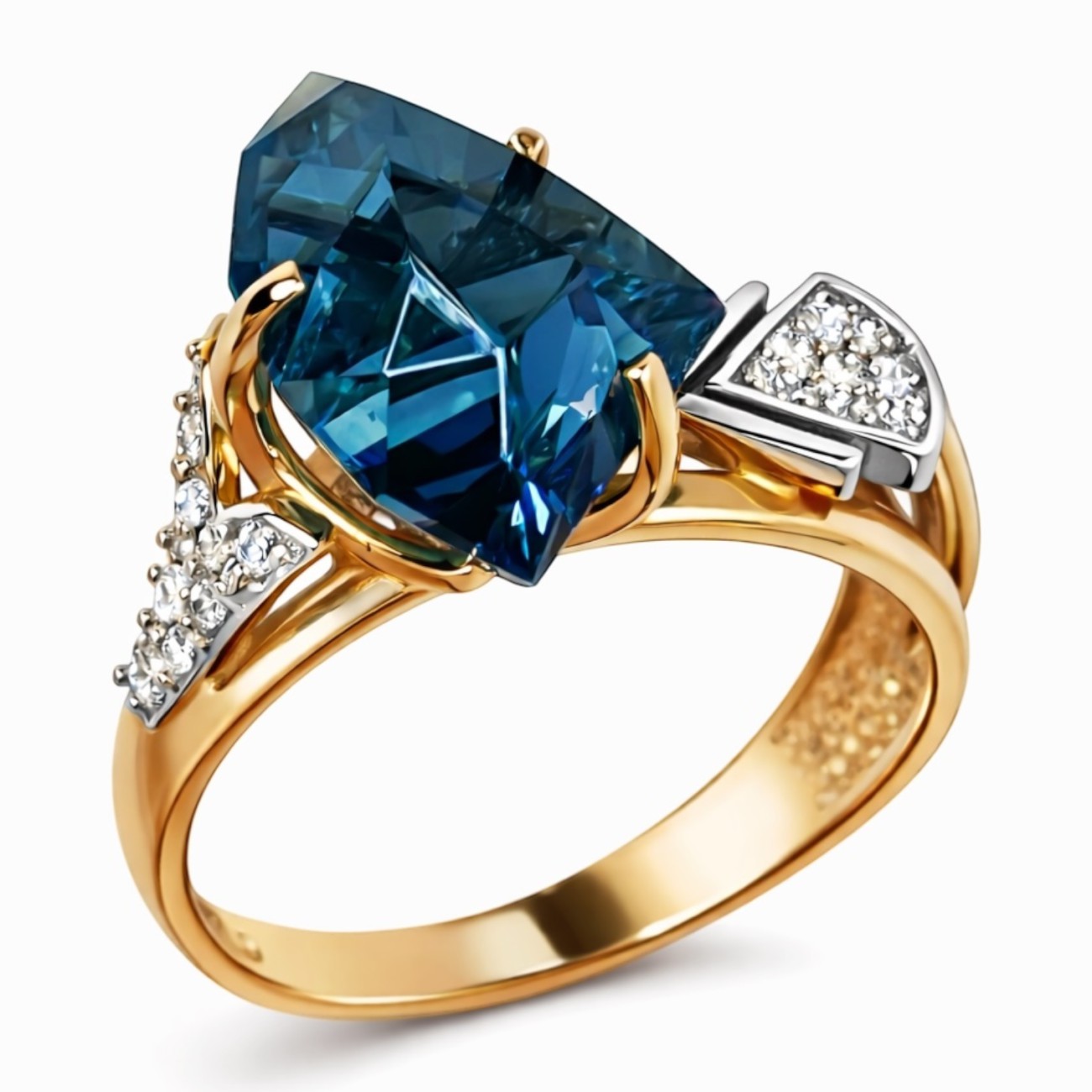 Елегантна золота каблучка з блакитним топазом — прикраса, що зачаровує своєю свіжістю та благородним сяйвом. Центральний камінь ніжного блакитного відтінку асоціюється з чистим небом і спокоєм, а розсип дрібних фіанітів делікатно підкреслює його красу, додаючи каблучці додаткового блиску.